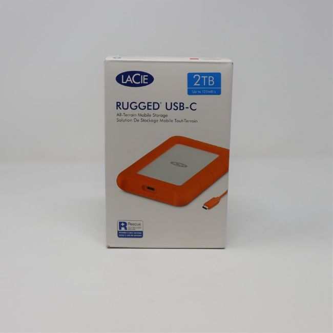 A boxed as new LaCie Rugged Thunderbolt USB-C 2TB Portable External Hard Drive (Box opened).