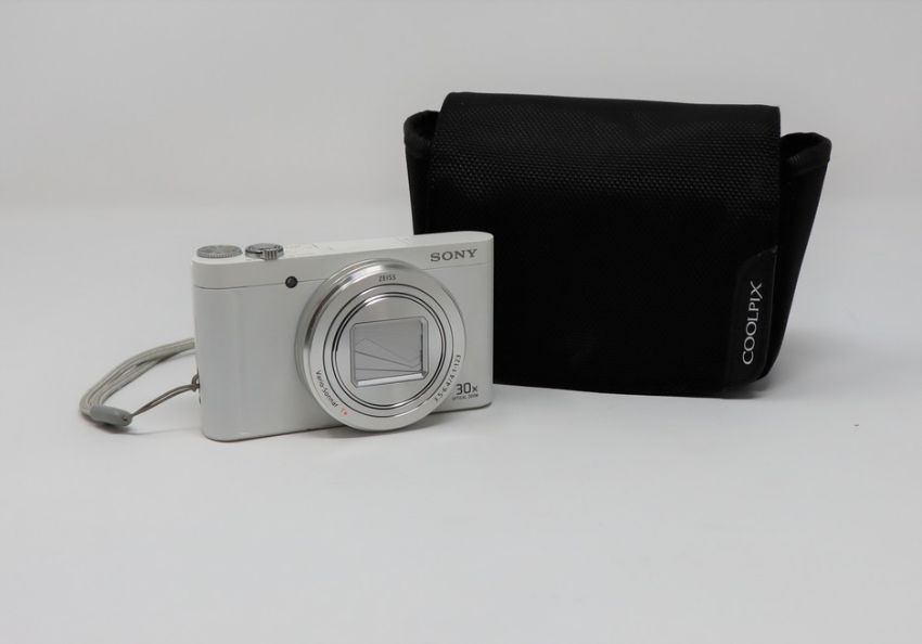 A pre-owned Sony Cyber-shot DSC WX500 Digital Camera in White with a Sony NP-BX1 battery, a SanDisk Ultra 32GB SD Card and a Nikon Coolpix Storage Pouch (Some damage to camera casing, does not affect function).