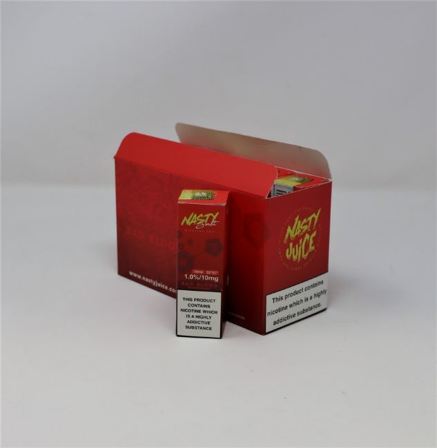 Ten boxed as new 10ml bottles of Bad Blood Blackcurrant Nic Salt E-Liquid by Nasty Juice (2%/20mg nicotine) (Best before Sept 2022) (Over 18's only).