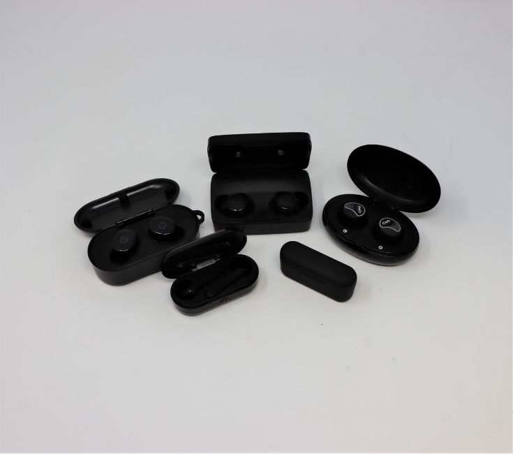 Five pre-owned wireless headphones with charging cases; 1 x BlueAnt Pump Air Sportsbuds, 1 x Enacfire Future Plus Earbuds, 1 x TOZO T1 Earbuds, 1 x TWS L8 Earbuds and 1 x XQIST Earbuds.