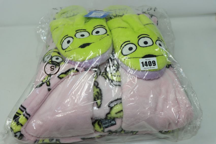 One as new Toy Story pink dressing gown with aliens size L/XL. One as new Toy Story alien slippers size 36/37.