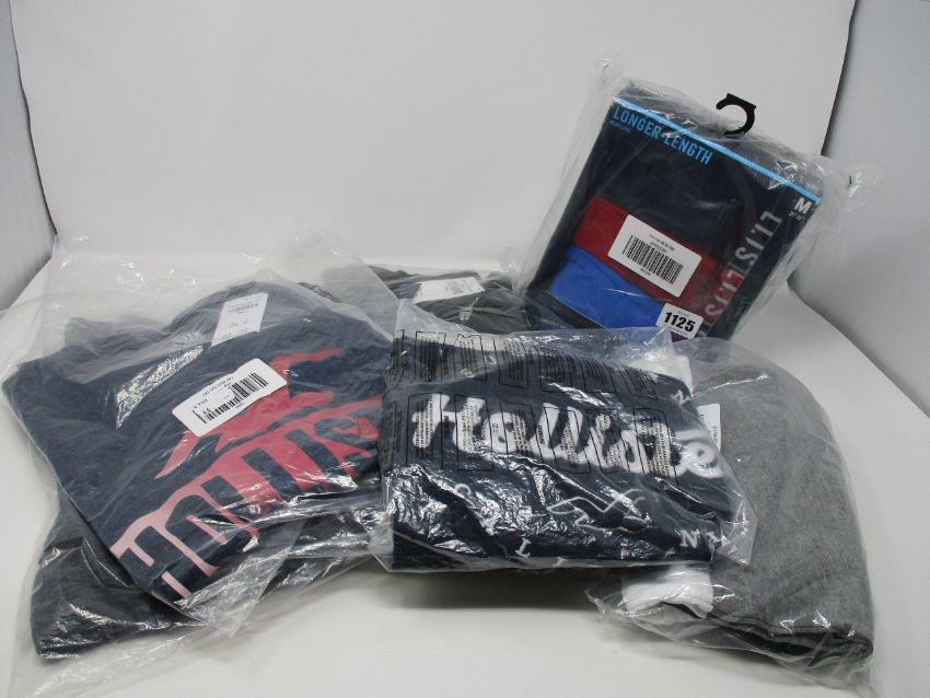 One as new Hollister black zip-up hoodie size XS. One as new Hollister dark grey long sleeve shirt size S. Two as new Hollister blue t-shirt size S. One as new Hollister block long sleeve hooded shirt size S. One as new Hollister plus long longer length trunk size M (pack of 3).