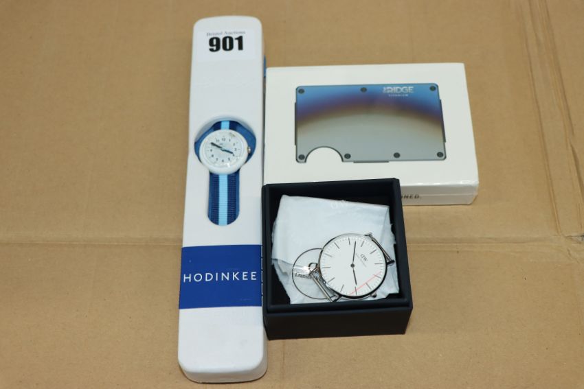 An as new Daniel Wellington watch (Classic B36SW37 - no strap), a child's as new Flik Flak watch and an as new The Ridge Titanium wallet.