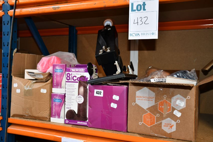 A quantity of assorted adult toys to include 8" Ultra chocolate cock, fantasy for her, ten boxes of 12 Pasante intensity comdoms and a box of small vibrator's and related items.