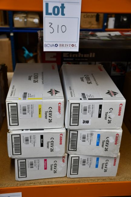 Six Canon C-EXV 26 toner cartridges (2 x cyan, 2 x black, 1 x magenta and 1 x yellow).