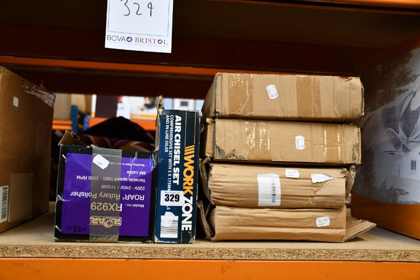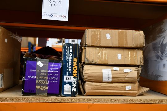 Four boxed damaged Deworx Electric drill (Model no. 43-627), one boxed Workzone Air Chisel Set with 5 x 175mm chisels and in-line oiler and one boxed damaged Roar Rotary Polisher (Model no. rx929).