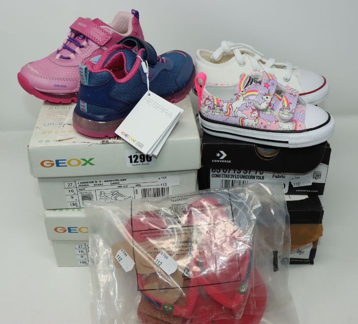 One girl's as new Geox J Android blue shoes size UK 9 (J0245A). One girl's as new Geox J Android fuchsia shoes size UK 9 (J0245A). One kid's as new Converse All Star size UK 9 (2502211070). One toddler's as new Converse Unicorn shoes size UK 6 (8507133770). One as new Havaianas flamingo flip flops size 23/24.