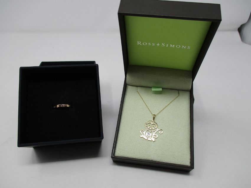 One as new Ross Simons 14kt Yellow Gold Monkey Pendant Necklace with Diamond Accents 18" (928269). One as new Daniel Wellington rose gold classic ring.