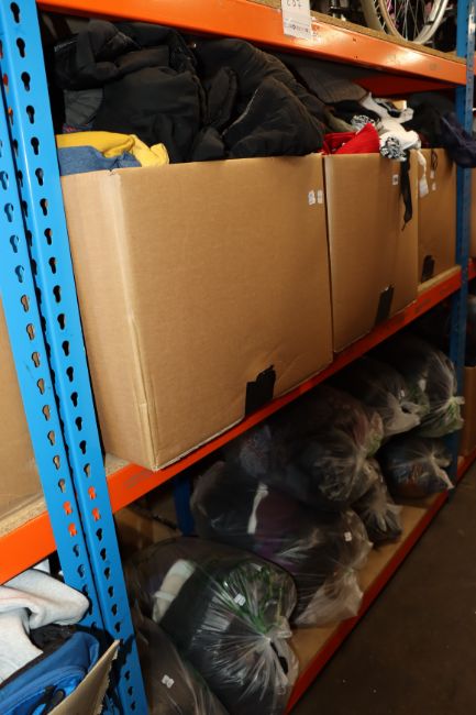 Six boxes and eight bags of assorted clothing and related items.