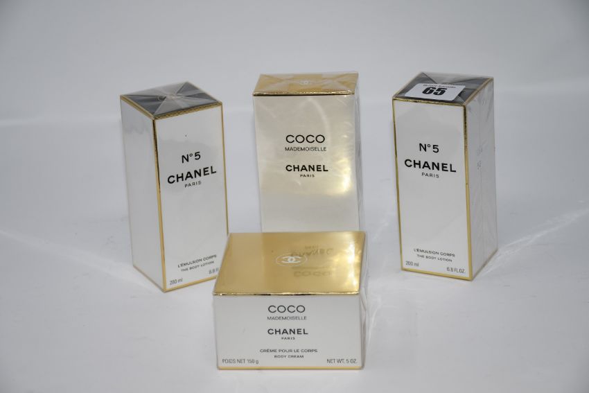 Two Chanel No 5 The Body Lotion (200ml), one Coco Mademoiselle Moisturizing Body Lotion (200ml) and one Coco Mademoiselle Body Cream (150g), all boxed as new.