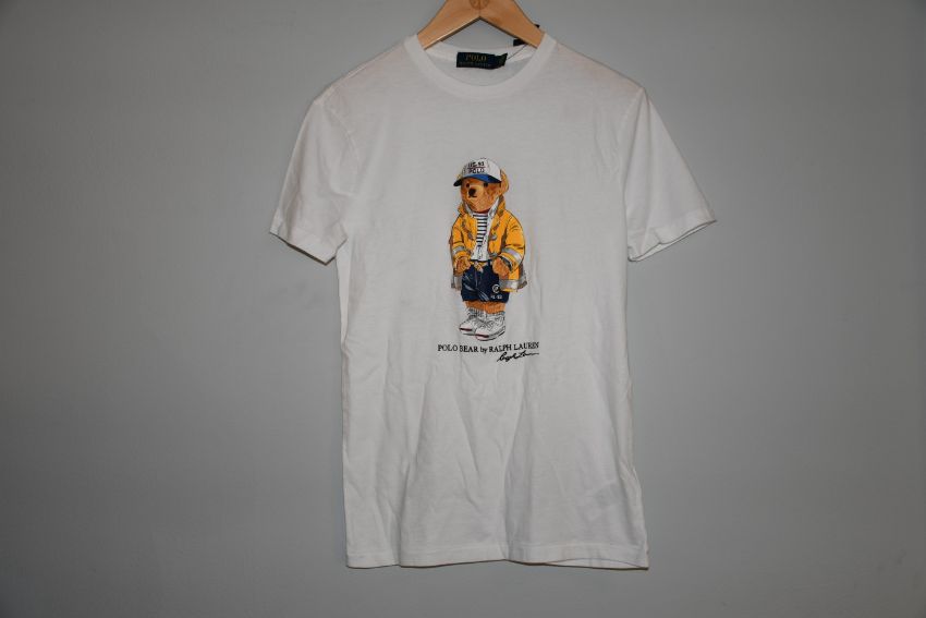 Two as new classic Ralph Lauren white t-shirt with bear motif to the front (XS, XL).