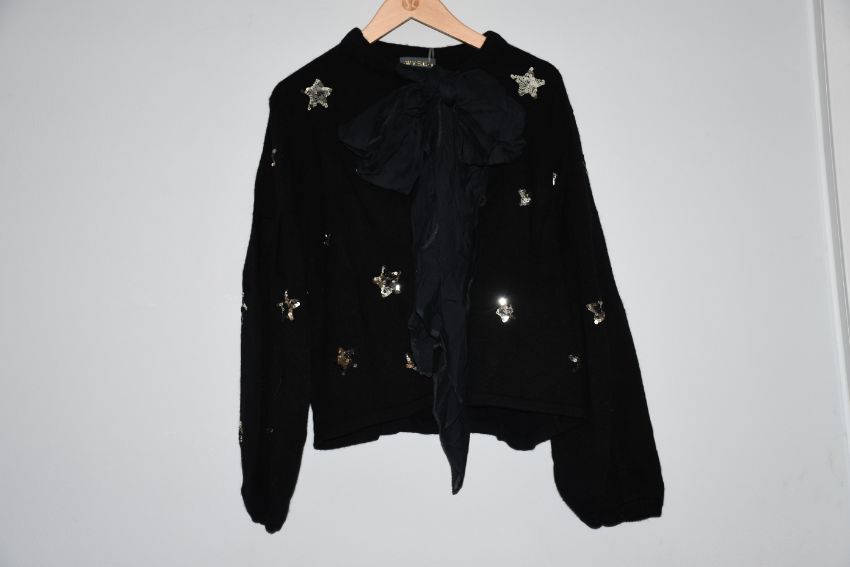 An as new Wyse of London black sequined star cardigan with a ribbon bow and balloon sleeves (Size unknown).