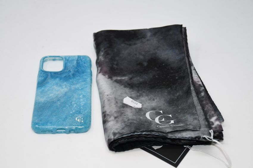An as new Camilla Ghione Deep Thoughts silk scarf (RRP €249) together with a Camilla Ghione phone case.