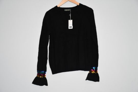 An as new Wyse of London black round neck jumper with sequin cuffs (Size 1).