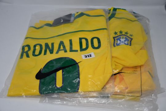 Two as new retro Nike Brazil Ronaldo No 9 football tops (UK M), one as new retro Nike Brazil Ronaldinho No 11 football top and one as new retro Umbro Ronaldinho No 20 football top (UK M).