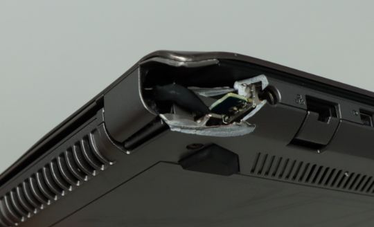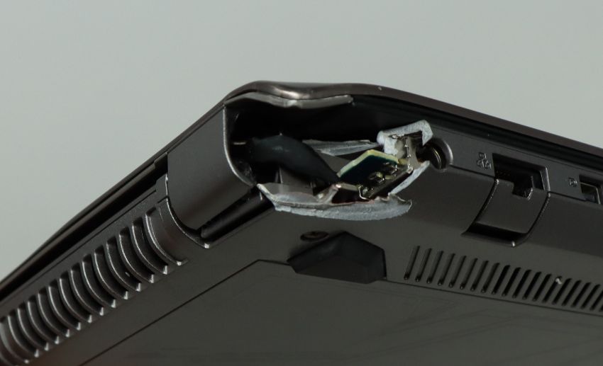 A pre-owned Asus ROG STRIX GL502VM-FY497T 15.6" Gaming Laptop in Titanium with Intel Core i5-7300HQ, 8GB RAM, 128GB SSD running Window 10 (Significant damage to casing, missing part of corner plastic, lid corner bent. Sold for spares or repairs.) (Wiped and reset. No power supply or other accessories included).