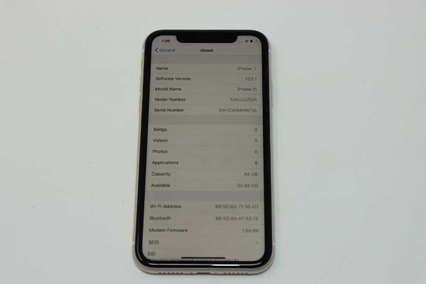 A pre-owned Apple iPhone 11 (US/Canada/A2111) 64GB in White (iCloud activation clear, Blacklist clear. Checkmend report ID: CM16456574-55CF1).