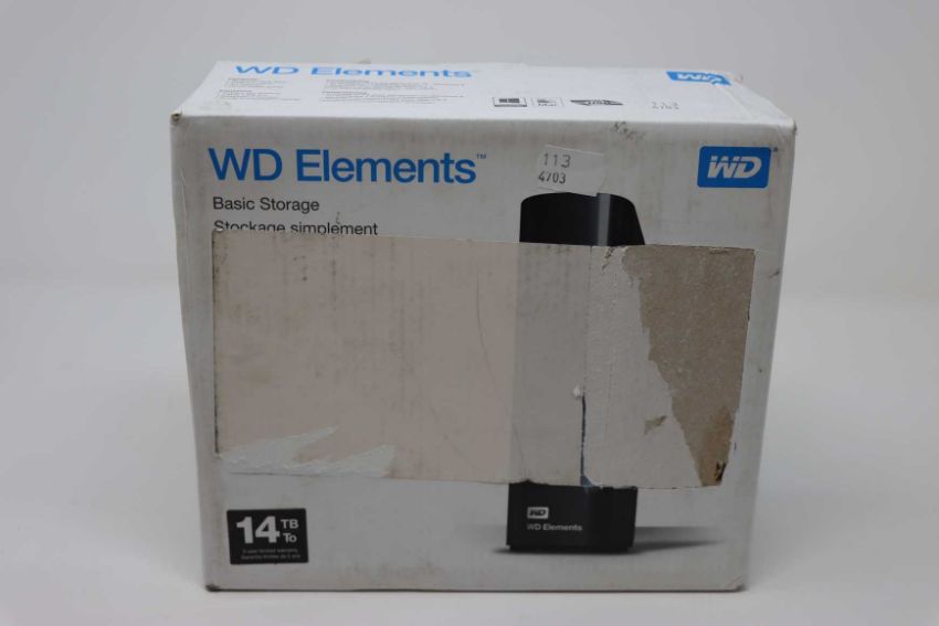 A boxed as new WD 14 TB Elements Desktop External Hard Drive with USB 3.0 and AC adapter, Black. Cosmetic damage to box.