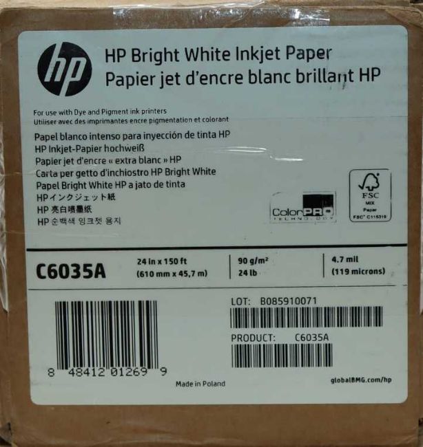 A boxed as new roll of HP Bright White Matte Inkjet Paper C6035A 90 gsm 610mm x 45.7m.