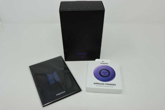 A boxed as new pair of Galaxy Buds+ BTS Edition in B.Purple (SM-R175NZPWEUA) with a boxed as new Samsung Wireless Charger BTS Edition and BTS photo cards (All packaging sealed).