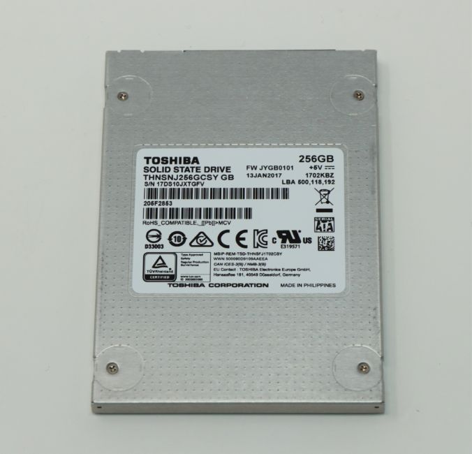 Four pre-owned Toshiba THNSNJ256GCSY 256GB SATA III 6gbs 2.5" 7mm Solid State Drives (Wiped).