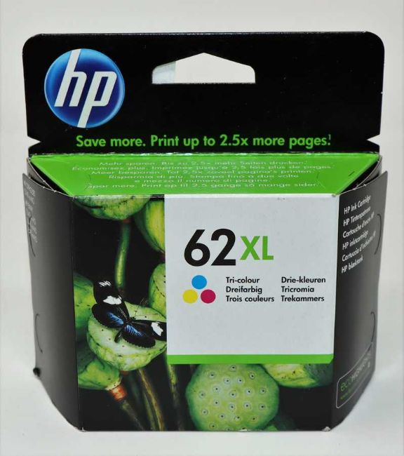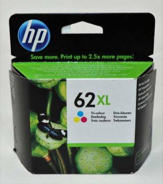 Four boxed as new HP 62XL High Yield Tri-Color Ink Cartridges (P/N: C2P07AE#UUS Expiry Date: May 2022).