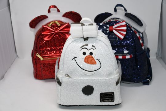 One as new Disney Loungefly - Frozen Olaf Mini Backpack - Disney Parks Exclusive. One as new Disney Loungefly Minnie Mouse Sequined Stars and Stripes Mini Backpack. One as new Disney Loungefly Minnie Mouse Sequined Mini Backpack - Red.