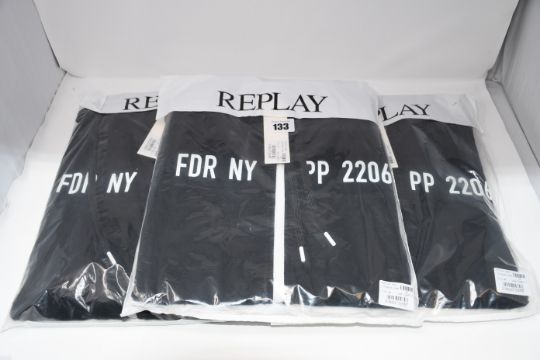 Three men's as new Replay Sportlab sweatshirts with print FDR NY PP 2206 in black (2 medium, 1 XXL).