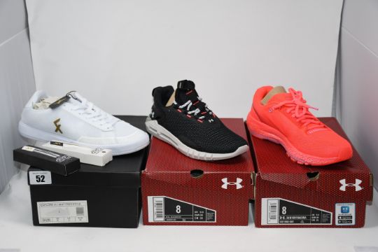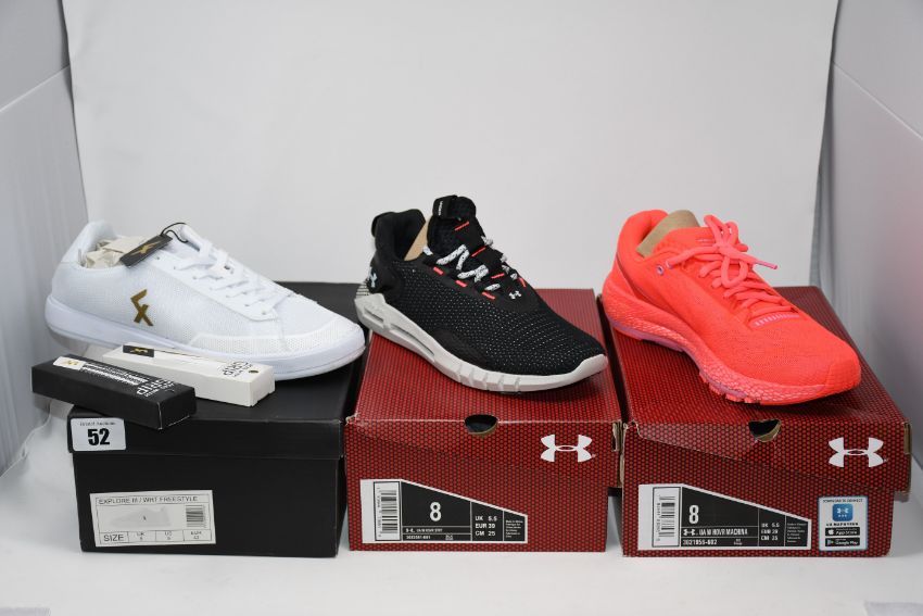 One as new Under Armour Women's UA HOVR STRT Sportstyle black Shoes size 8. One as new Under Armour Women's UA HOVR Machina red Running Shoes size 8. One as new 4Freestyle Explore III Freestyle and Street football shoes White size 8.