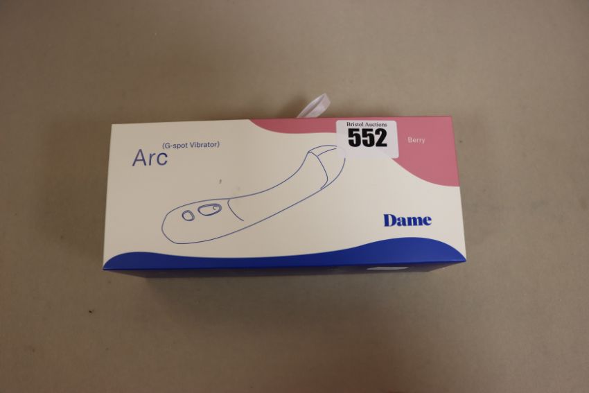 One boxed as new Dame Arc rechargeable silicone G-spot vibrator in berry (Over 18s only).
