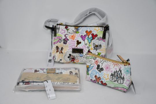 An as new Dooney & Bourke wallet from the Disney collection, An as new Dooney & Bourke cosmetics bag from the Disney collection and a as new Dooney & Bourke shoulder bag from the Disney collection.