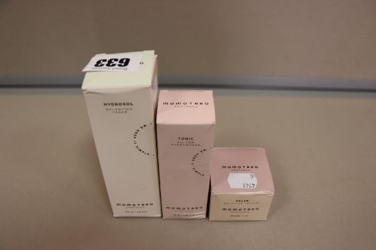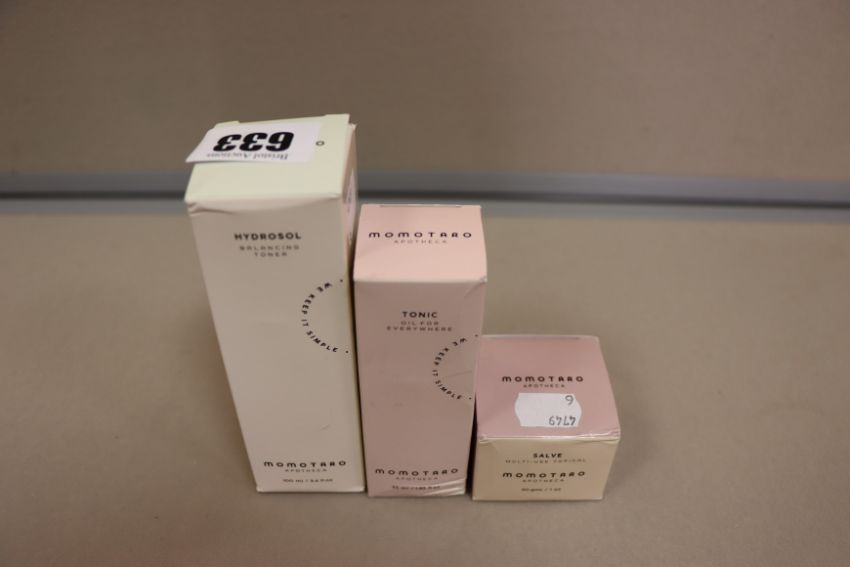 Three boxed Momotoaro Apotheca beauty products to include one Momotaro balancing toner (55ml), one Momotaro tonic oil (55ml) and one Momotaro Salve cream (30gms).