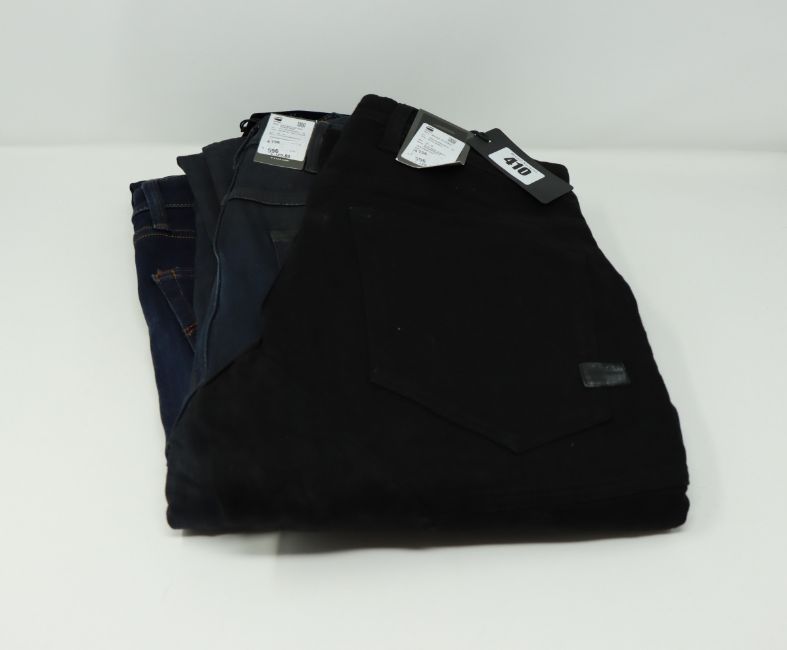 One as new G Raw women knee deep high skinny jeans (Colour: worn in tidal cobler. Size 28/30. Model: 5622). One as new G Raw Rackam 3D skinny jeans (Colour: pitch black. Size 28/30). One as new G Raw slim jeans (Colour: dark aged. Size 28/30. Model: 3301. Security tag attached).