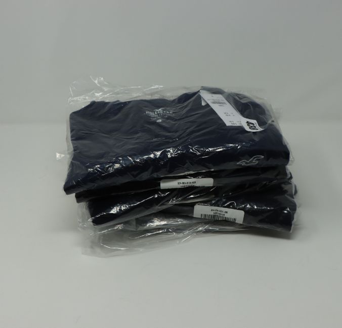 One as new Hollister long sleeve blue shirt size S. One as new Hollister long sleeve black shirt size M. One as new Hollister long sleeve black/white shirt size M. One as new Hollister t-shirt size M with printed palms image. One as new Hollister grey t-shirt size M. One as new Hollister white and grey shirt size M.