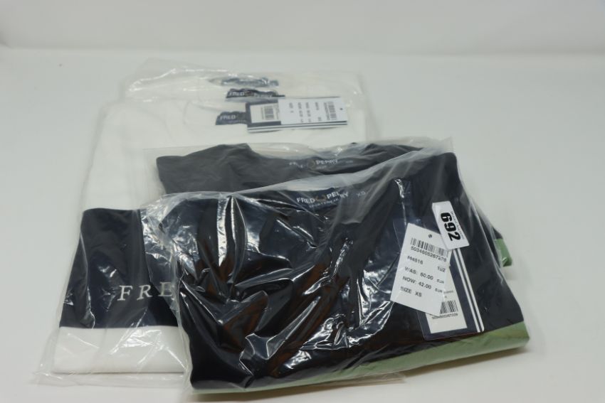Three as new Fred Perry Embroidered panel t-shirts size XS (M4516-102). One as new Fred Perry Embroidered panel t-shirt size XS (Col: 303. Model: M4516). Two as new Fred Perry Embroidered panel t-shirts size S (Col: 303. Model: M4516).