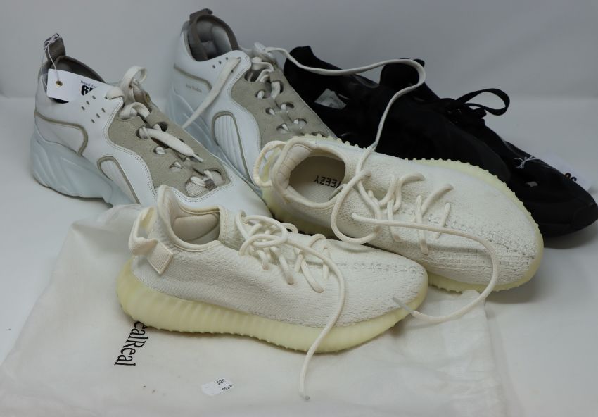 One Acne Studios Rockaway low-top leather trainers size 44 (No box). One pre-owned Acne Studios Buzz black sneakers (No box. Size unknown). One pre-owned Adidas Yeezy Boost 350 V2 Cream White size UK 5.5 (CP9366).