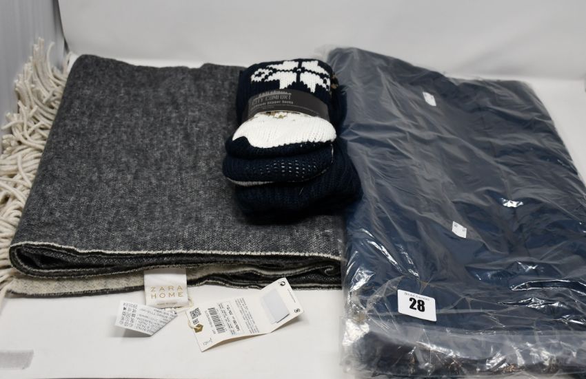 One as new In and Outdoor cushion cover Toni Blue size 30 x 50cm (60006307-22101). One as new Zara Home Plain double-sided cotton and acrylic blanket size 140 x 190 cm (9188/004). Two as new City Comfort Premium Slippers navy and white socks.