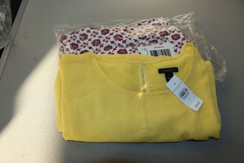 One as new Ann Taylor Dotted Ruched Lemon custard sleeve top size L. One as new Ann Taylor Button back linen white and purple floral top size L.