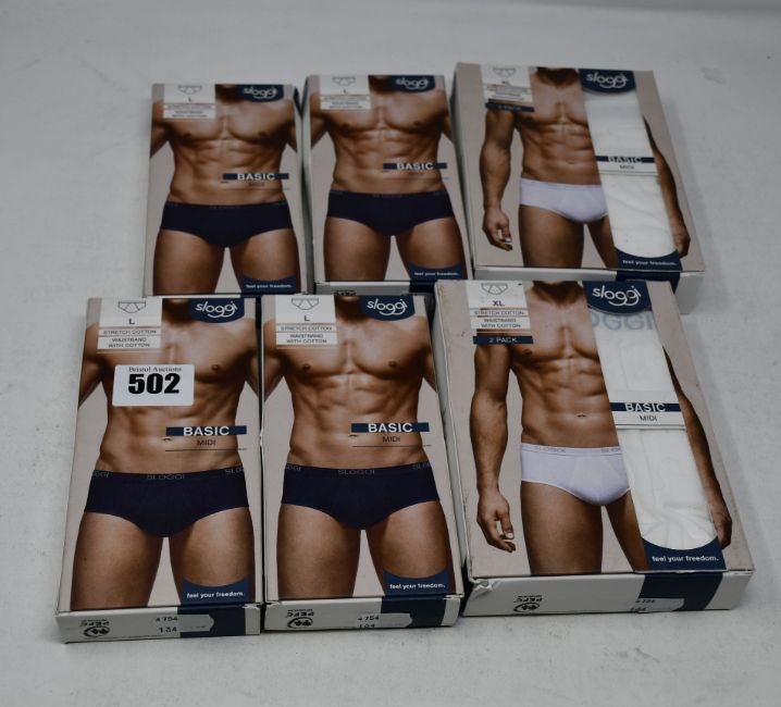 Two as new Sloggi basic midi white cotton brief size XL (pack of two). Four as new Sloggi basic midi blue cotton brief size L (single pack).
