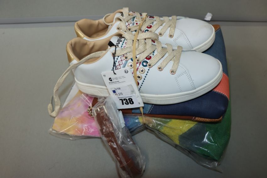 One as new Desigual Faded Fine jumper with diamonds size L (20SWJF41). One as new Desigual Centauri Kemi Shoulder bag (20SAXPE3). One pair of as new Desigual Cosmic New Exotic sneakers size 5 (20SSKL03 1000) (Slight dust marks to the side).