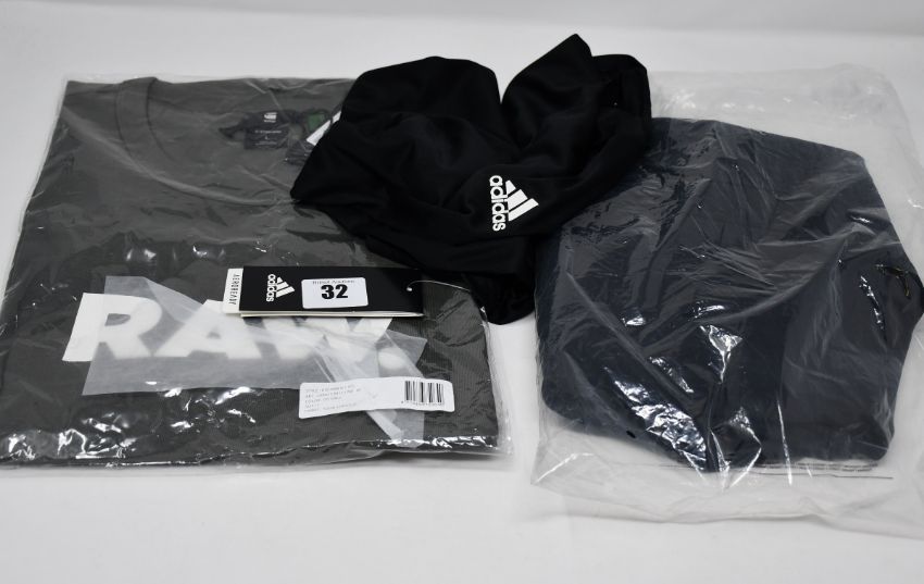 One as new Adidas Rise Up N Run Jacket size XL (DZ1575). One as new Adidas Own the Run 3 Stripes vest size L (FP7540). One as new G Star Holorn green tee size L.