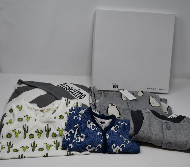One as new Monica + Andy organic hooded towel. One as new Monica + Andy Racerback Santa Fe cactus shortall size 3-6 months. One as new Monica + Andy Great wave one piece size 0-3 months. One as new Monica + Andy Varsity Jacket Romper size 0-3 months. One as new Monica + Andy Penguin pals hooded romper size 9-12 months.