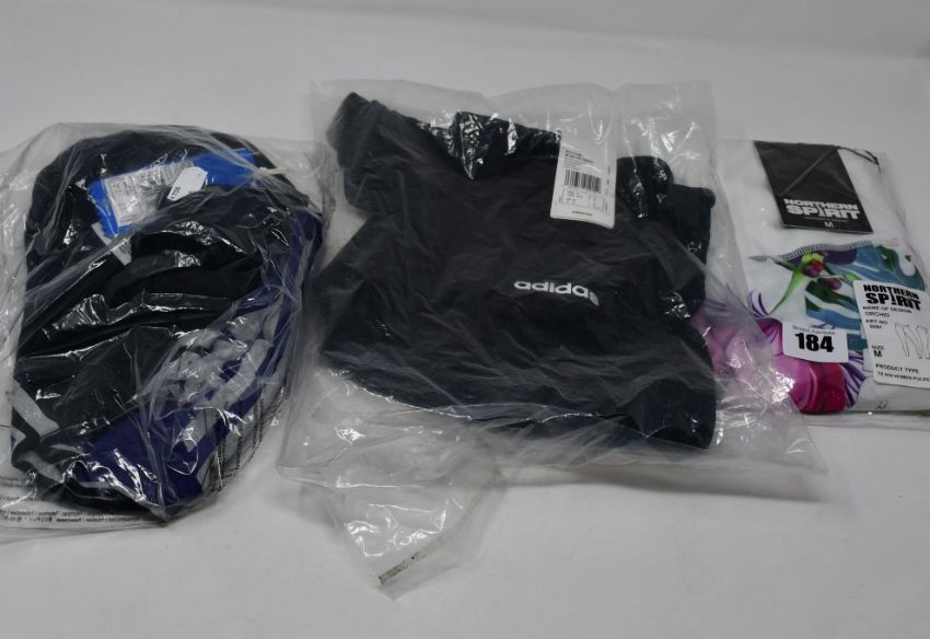 One as new Adidas fillet label t-shirt size M (ED6936). One as new Adidas 7/8 leggings size M (EC1746). One as new Northern Spirit orchid leggings size M.