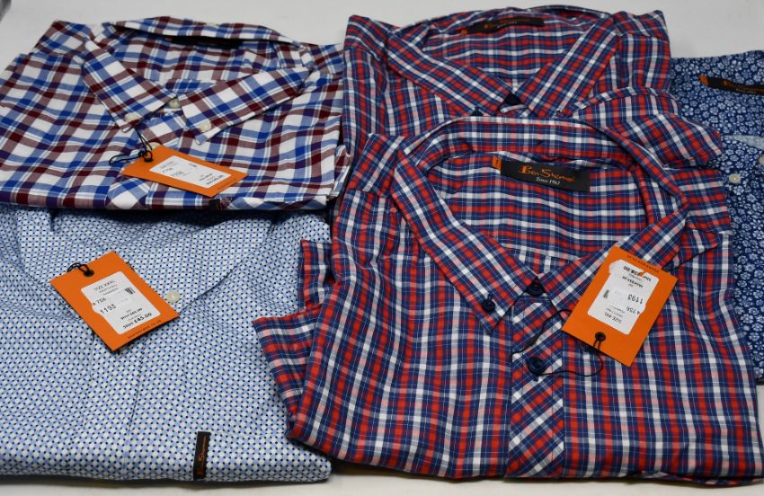One men's as new Ben Sherman Short Sleeve Floral Print shirt size 3XL. One men's as new Ben Sherman House Checked Long Sleeved shirt size 3XL. One men's as new Ben Sherman House Checked Long Sleeved shirt size 4XL. One men's as new Ben Sherman Short Sleeve Large Check shirt size 3XL. One men's as new Ben Sherman navy dotted shirt size 3XL.
