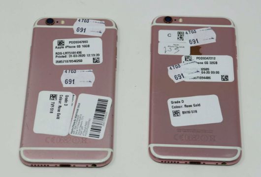 A pre-owned Apple iPhone 6s (Global/A1688) 16GB in Rose Gold (iCloud activation lock clear, scratches to screen glass) and pre-owned Apple iPhone 6s (Global/A1688) 16GB in Rose Gold (iCloud activation lock clear, damaged screen glass) (Sold for spares or repairs).