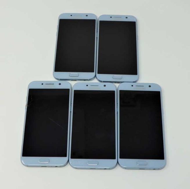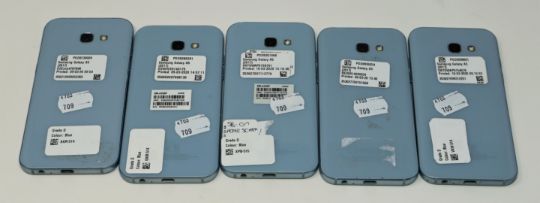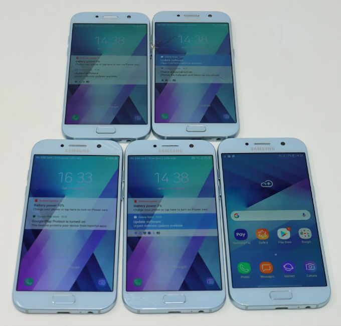 Five pre-owned Samsung Galaxy A5 2017 SM-A520F 32GB in Blue (All FRP clear. four with damaged screen glass, one with faulty display. Sold for spares or repair).