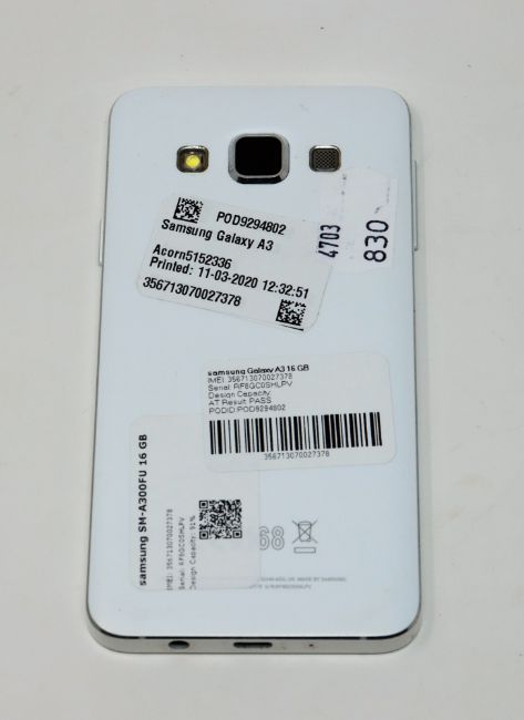 A pre-owned Samsung Galaxy A3 SM-A300FU 16GB in White (FRP clear) (Checkmend report ID: CM16558805-B2527).