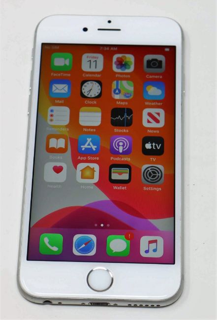 A pre-owned Apple iPhone 6s (Global/A1688) 32GB in Silver (iCloud activation lock clear) (Checkmend report ID: CM16546436-6511B).
