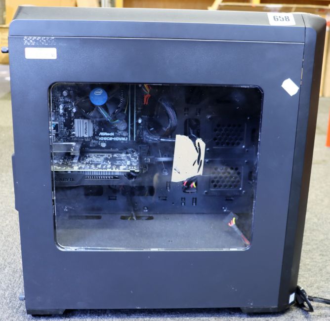 A pre-owned Custom Tower Computer Intel Core i7-9700k CPU @ 3.60 GHZ, 16GB RAM, 125GB SSD, running Windows 10 Home.