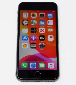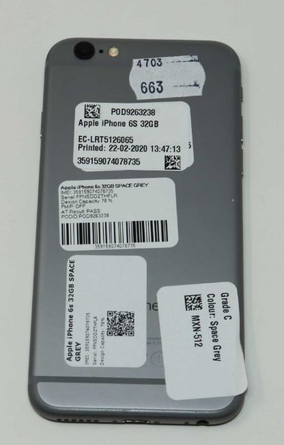 A pre-owned Apple iPhone 6s (Global/A1688) 32GB in Space Grey (iCloud activation lock clear, scratches to screen glass) (Checkmend report ID: CM16545380-B7F65).
